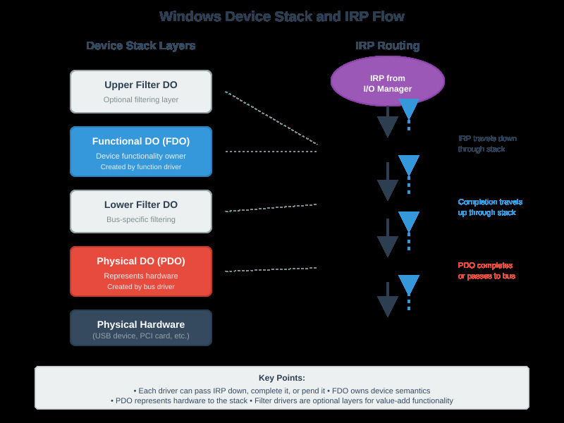 Each device in Windows exists as a DEVICE_OBJECT structure pointed to by a DeviceNode in the PnP Manager’s tree. When you call IoGetDevicePropertyData(), the kernel walks from your DEVICE_OBJECT up through the device stack, checks each layer’s property store, then falls back to registry keys under Enum\<Enumerator>\<DeviceID>. This isn’t a simple lookup—it’s a multi-step traversal with locking at each level.