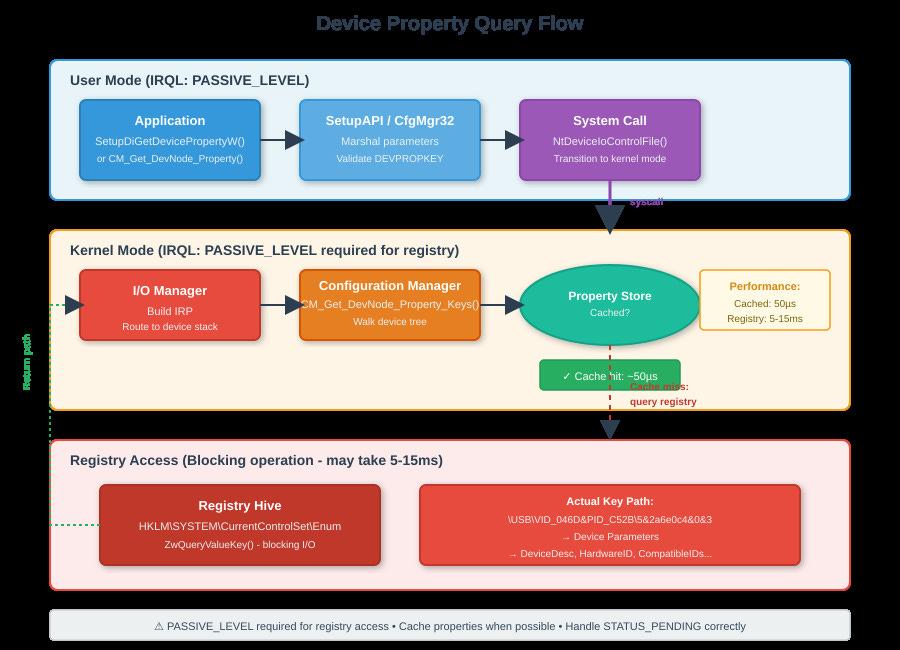 Property queries require PASSIVE_LEVEL because they hit the registry through CM_Get_DevNode_Property_Keys(). If you’re at DISPATCH_LEVEL and call this, instant bugcheck (IRQL_NOT_LESS_OR_EQUAL). The registry access itself uses ZwQueryValueKey(), which can block for milliseconds if the registry hive isn’t cached. I’ve measured 5-15ms for cold registry reads vs. 50µs for cached property data.