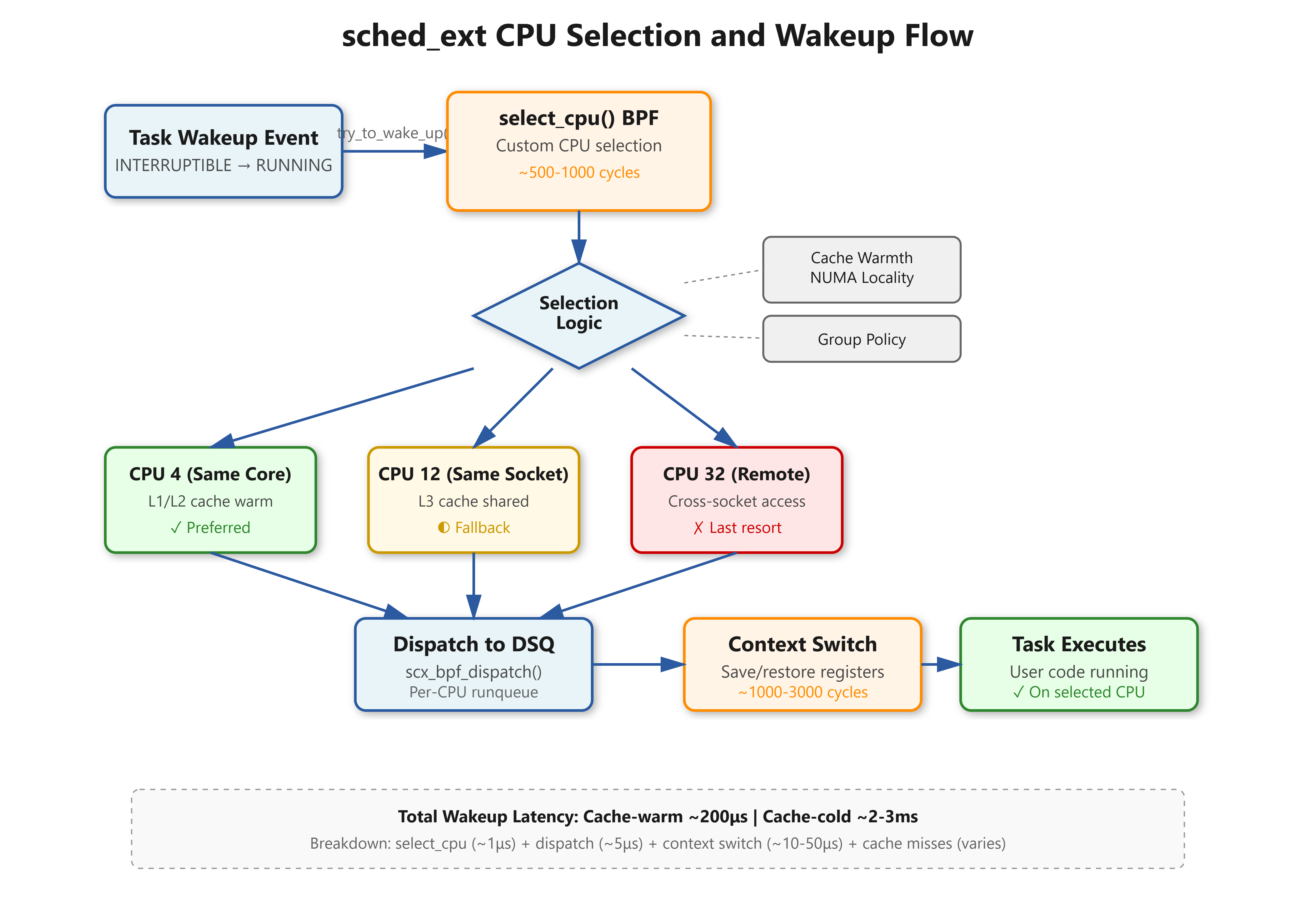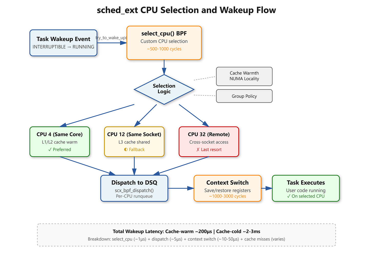 When a task transitions from TASK_INTERRUPTIBLE to TASK_RUNNING, the kernel calls try_to_wake_up(). With CFS, you get whatever the load balancer thinks is fair. With sched_ext, your select_cpu() callback runs in BPF context and returns the target CPU. This happens millions of times per second, so your logic needs to be fast—under 1000 CPU cycles typically.