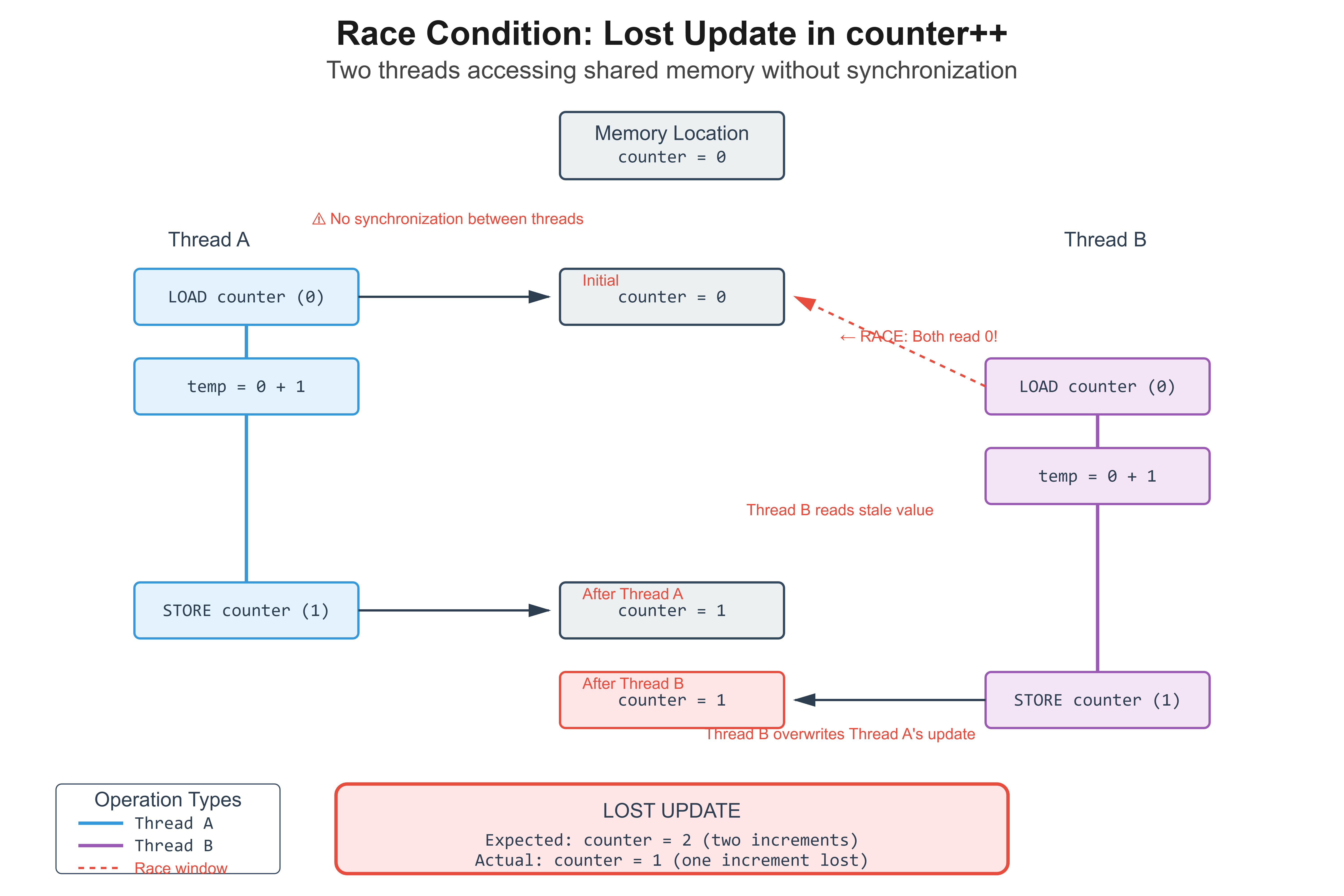 counter++you thought was atomic? It’s load-modify-store, and another thread can slip between those operations.