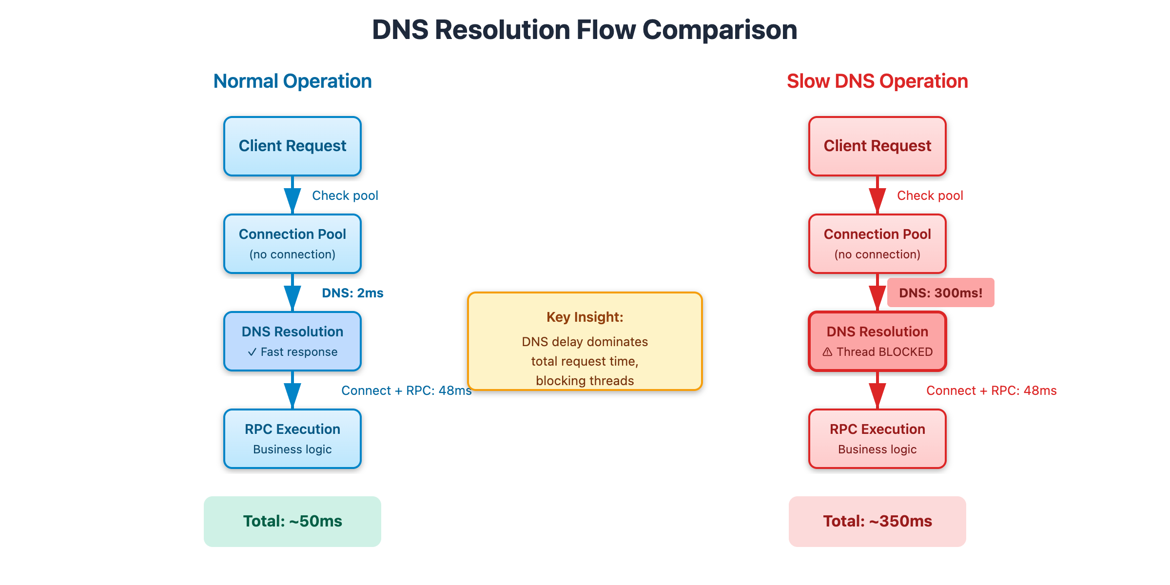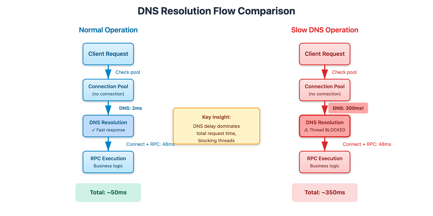 Here’s the thing about DNS lookups that catches people off guard. When your service needs to connect to another service, it has to resolve the hostname to an IP address. In most programming languages, this happens through a synchronous system call like getaddrinfo(). That means the thread making the request just sits there, doing nothing, waiting for the DNS response.