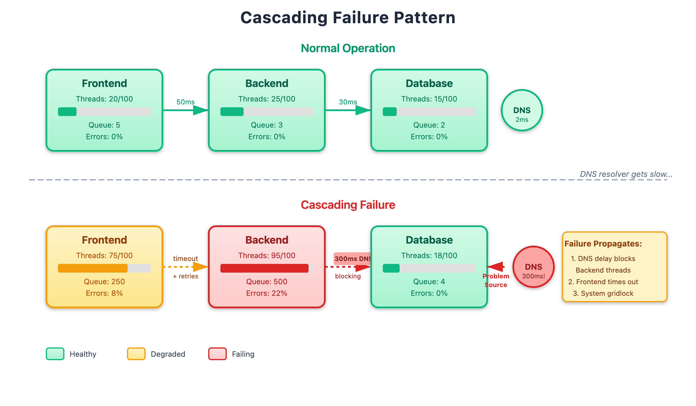 The retry behavior makes it worse. When Service A times out waiting for Service B, it often retries. So now Service B is getting the original request plus retries, all while its threads are blocked on DNS. This is the “retry storm” that turns a small problem into a complete outage.