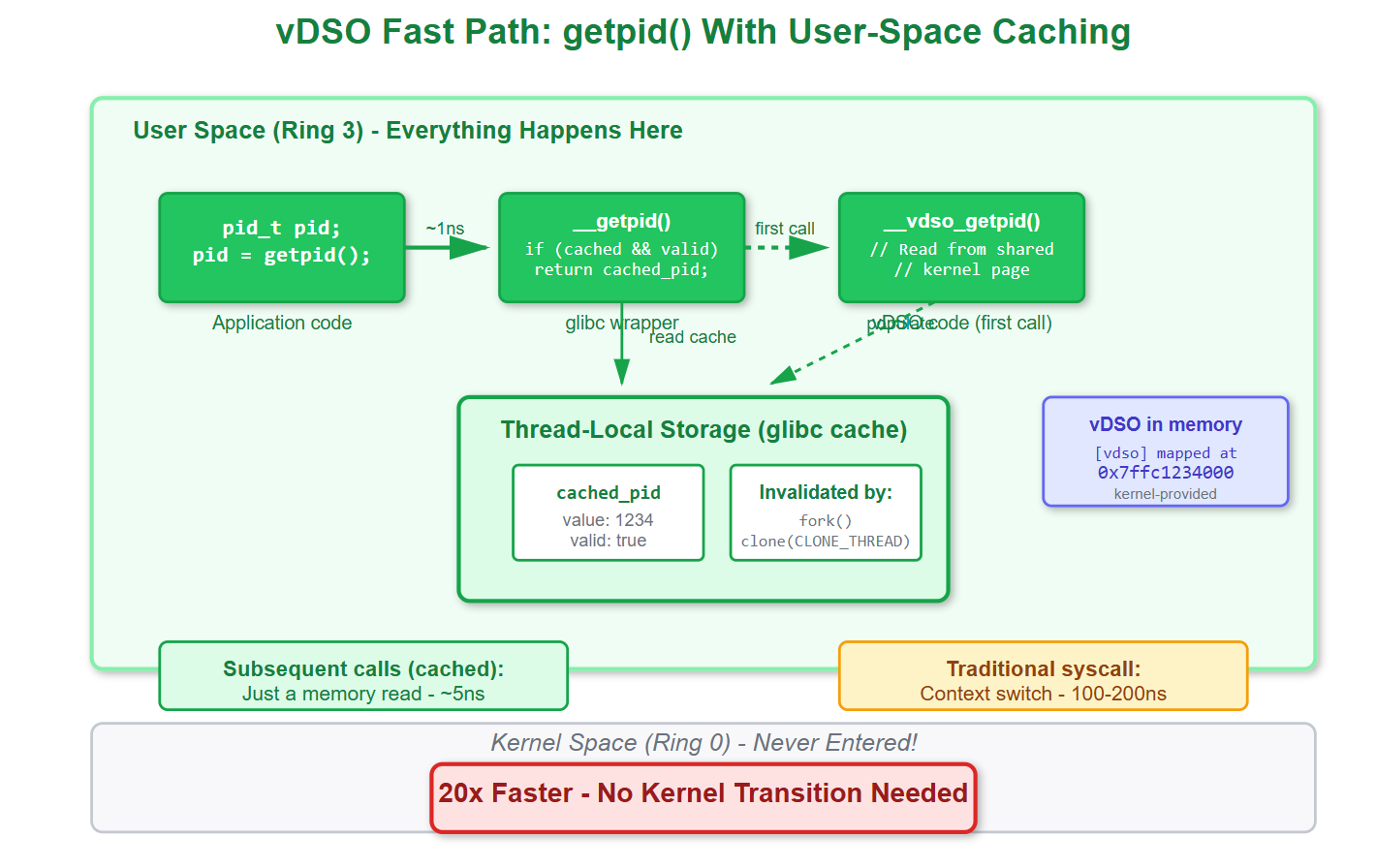 The vDSO code runs entirely in user space (ring 3). For `getpid()`, glibc actually caches the PID in thread-local storage after the first call. Subsequent calls just return the cached value—a single memory read. No syscall, no context switch, no kernel code.