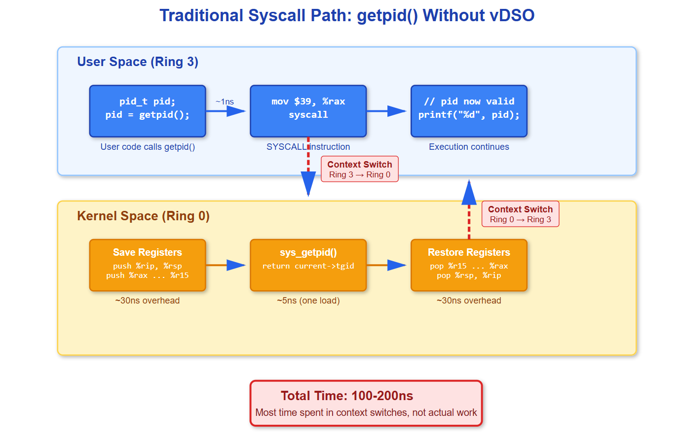 getpid()calls from a logging library that helpfully includes the PID in every log line. Each call looks harmless—just fetch a number the kernel already knows. But at 100 nanoseconds per call and 10 million logs per second, you’re spending 1 full CPU core just asking “who am I?”This is exactly the kind of overhead that killed performance before vDSO. Every