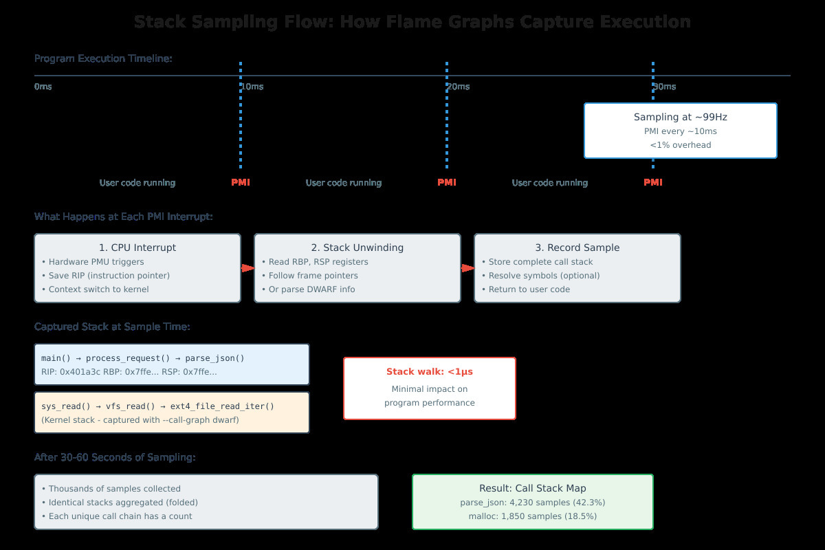 Flame graphs work through statistical profiling. Every ~10 milliseconds, the kernel interrupts your program, captures the instruction pointer and walks the stack to record the complete call chain. After thousands of samples, you have a map of where your program actually spends time.