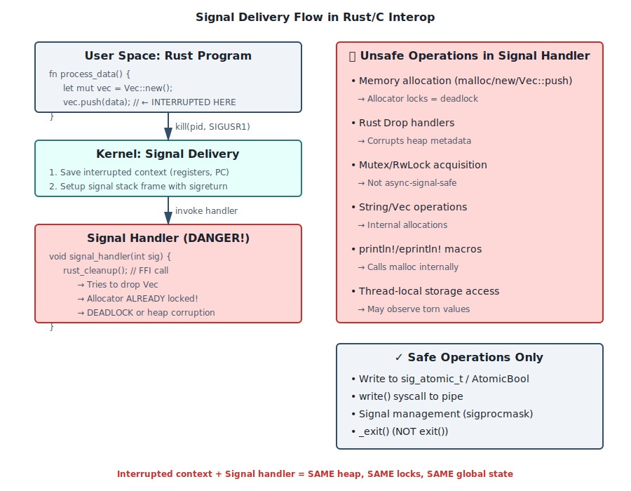 Signals are asynchronous interrupts that can arrive mid-instruction. Your Rust code might be halfway through updating a Vec’s length when SIGTERM hits. If your C signal handler calls back into Rust code that touches that Vec, you’ve got heap corruption that only manifests under production load when signal timing aligns perfectly with allocation operations.
