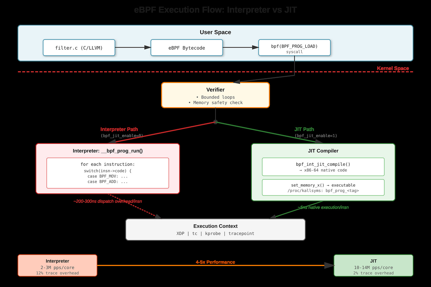eBPF programs execute as bytecode in the kernel, running in contexts like XDP (network packet processing), kprobes (kernel tracing), or tc (traffic control). Without JIT, the kernel interpreter