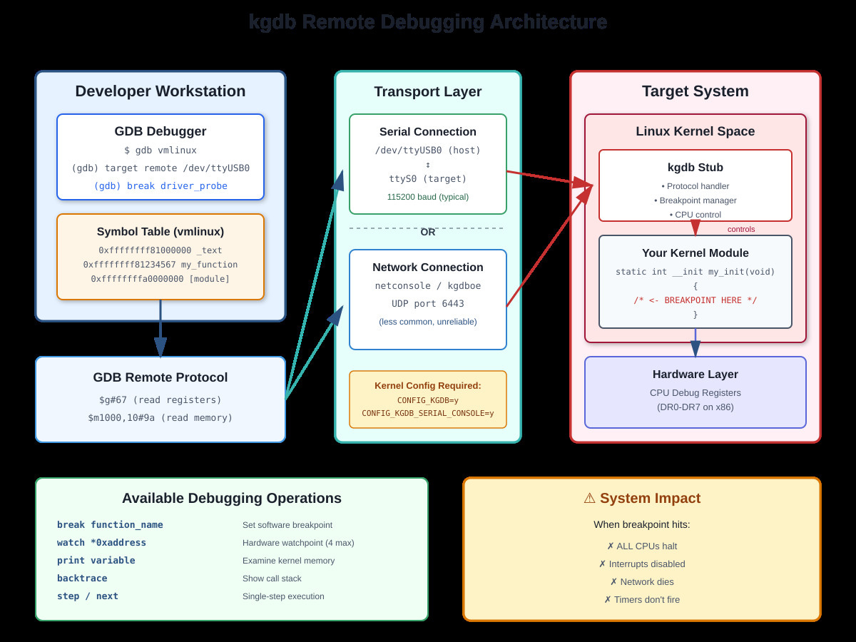 printk() tells you what happened. kgdb lets you stop it mid-flight. kgdb is a kernel stub that implements the GDB remote protocol, letting your host GDB control the target kernel over serial or network.