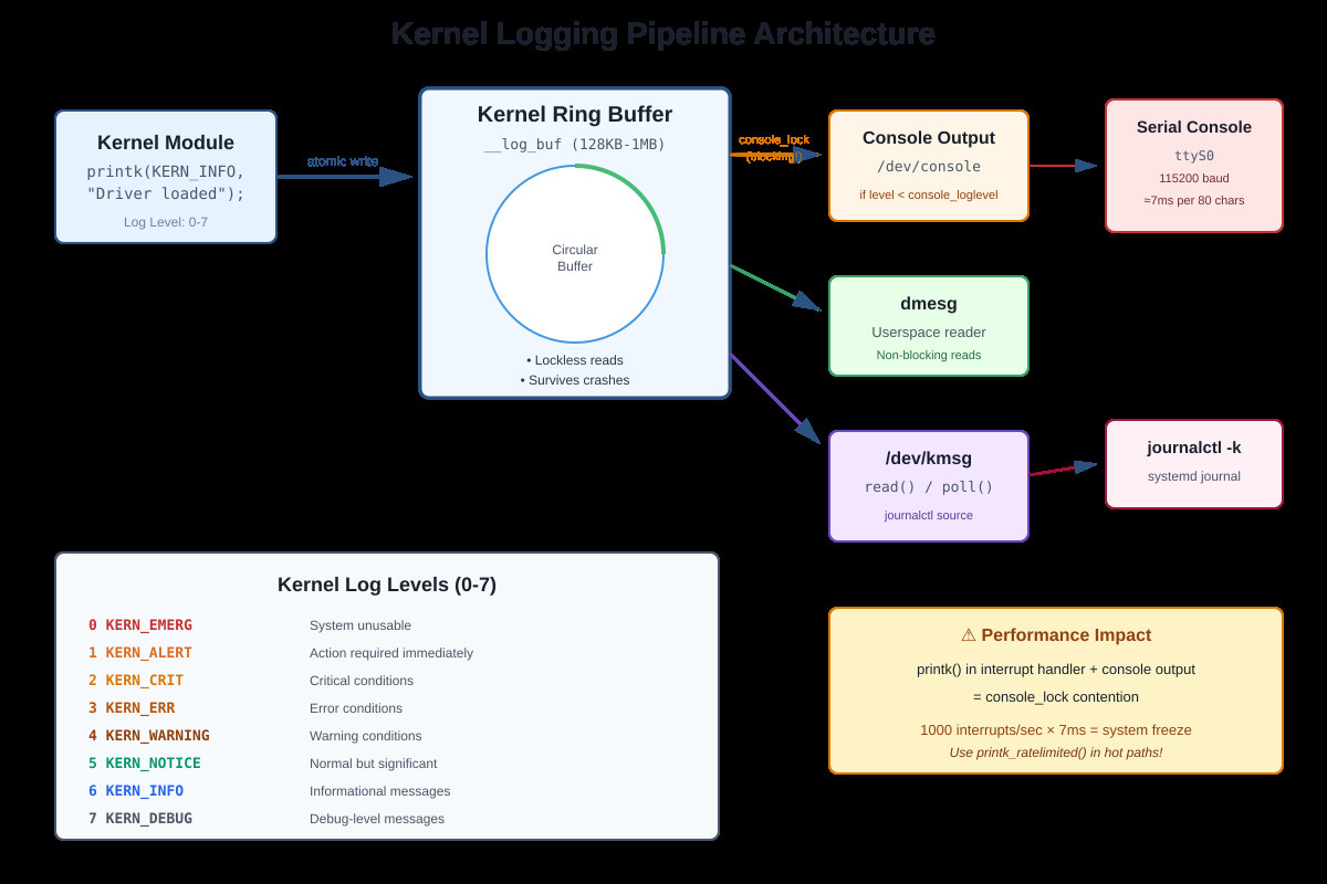 The console_lock problem: When printk() writes to the serial console, it acquires console_lock. At 115200 baud, printing 80 characters takes roughly 7ms. If you printk() in an interrupt handler that fires 1000 times per second, you’ll spend 7 seconds per second trying to print. System freezes. I’ve seen production systems lock up because someone enabled debug logging in a high-frequency network interrupt.