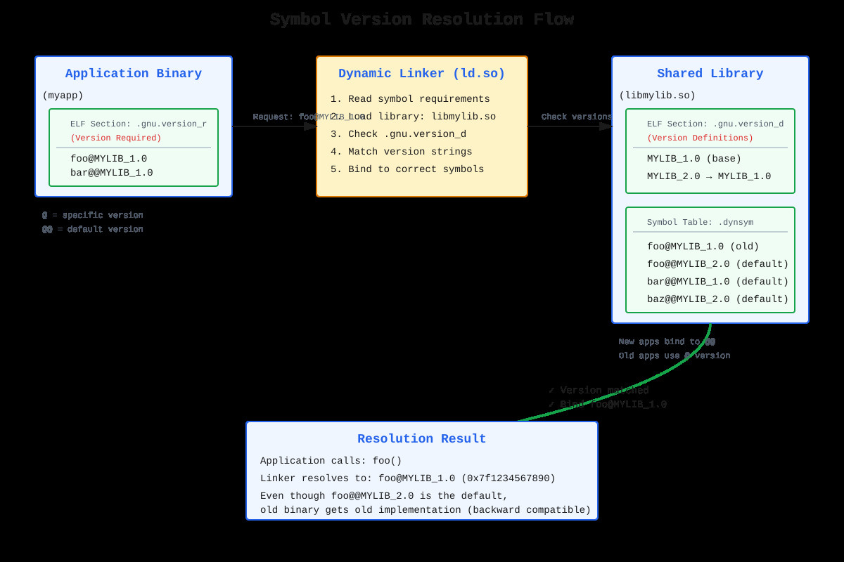 Symbol versioning solves this by letting multiple versions of the same function coexist in a single shared library. When glibc ships a faster memcpy implementation, old binaries keep using memcpy@GLIBC_2.2.5 while new ones get memcpy@@GLIBC_2.14. Both work, no recompilation needed. This isn’t magic—it’s a GNU extension to ELF that adds version metadata to symbol tables.