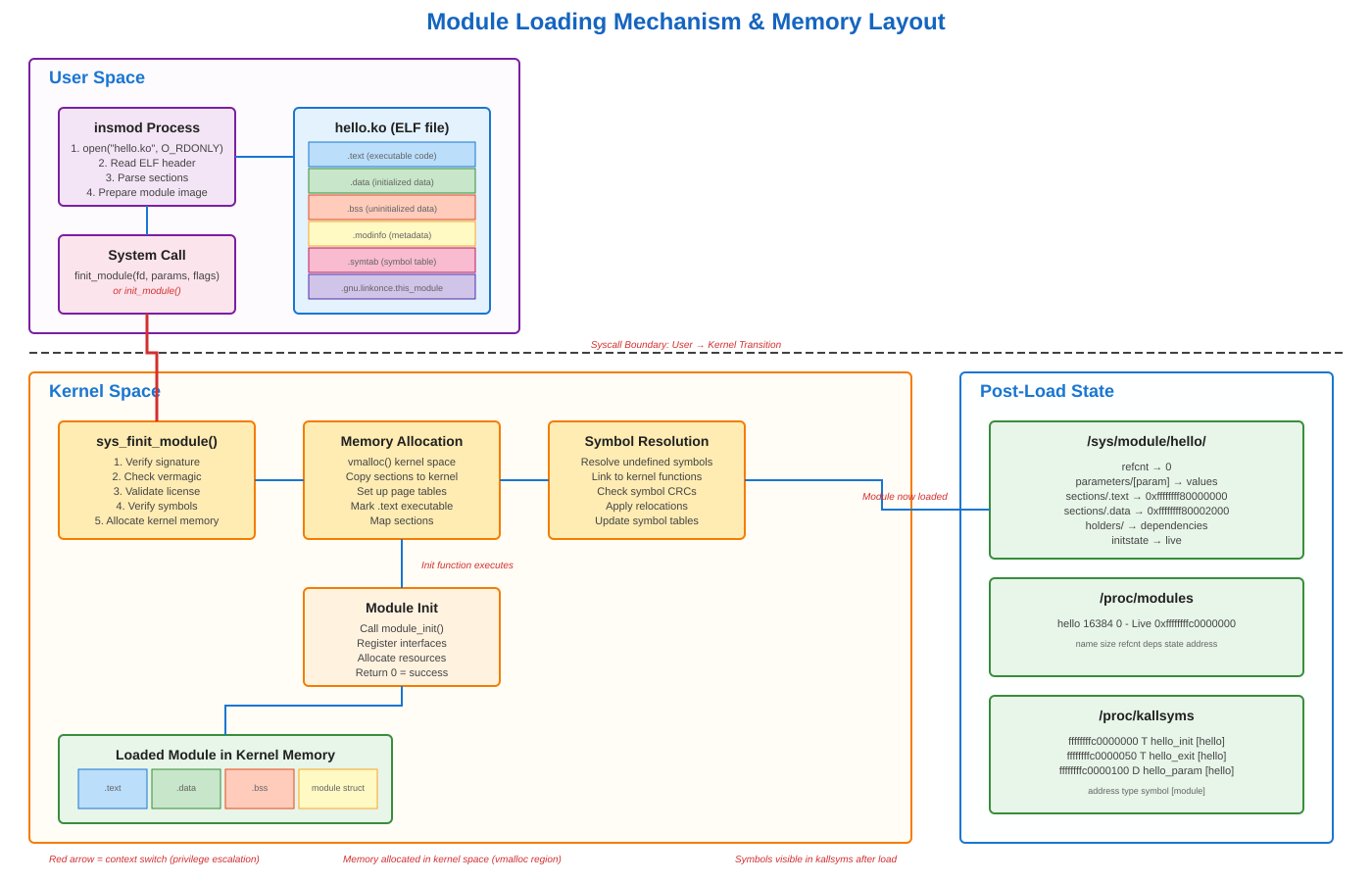 main(). They run in kernel space with different calling conventions, different stack layout, and zero tolerance for mistakes. On x86-64, the kernel uses a different memory model (-mcmodel=kernel) and disables the red zone (-mno-red-zone) because interrupts would corrupt it. Try to useprintf()and you’ll get linker errors - there’s no libc in kernel space. You useprintk()instead, which writes to a kernel ring buffer thatdmesgreads.The killer detail: your module must be compiled with the exact same compiler version and flags that built your running kernel. The kernel doesn’t have a stable ABI. If Ubuntu built kernel 6.2.0 with gcc 11.4, and you compile your module with gcc 12, you’re gambling with memory corruption. The kernel embeds a “version magic” string in every module: kernel version, compiler version, SMP status, and more. Load a module with mismatched magic and