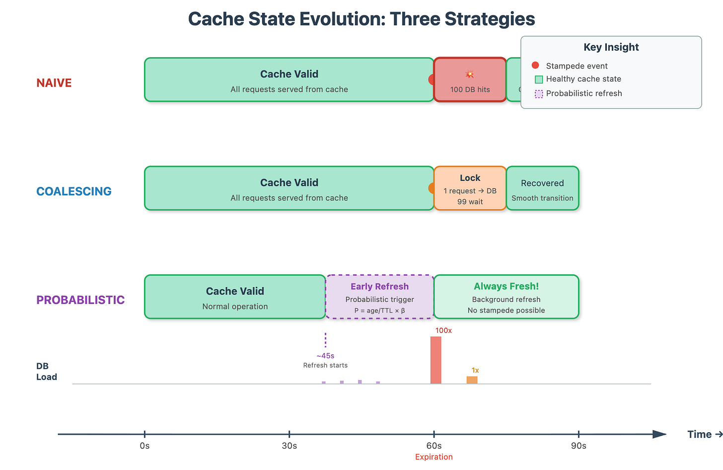 Your cache strategy should answer three questions: (1) Can my database handle the load if cache completely fails? If no, you need request coalescing. (2) Can I tolerate occasional slow requests? If no, you need probabilistic or background refresh. (3) Do I have traffic patterns with predictable spikes? If yes, pre-warm your cache before the spike hits.
