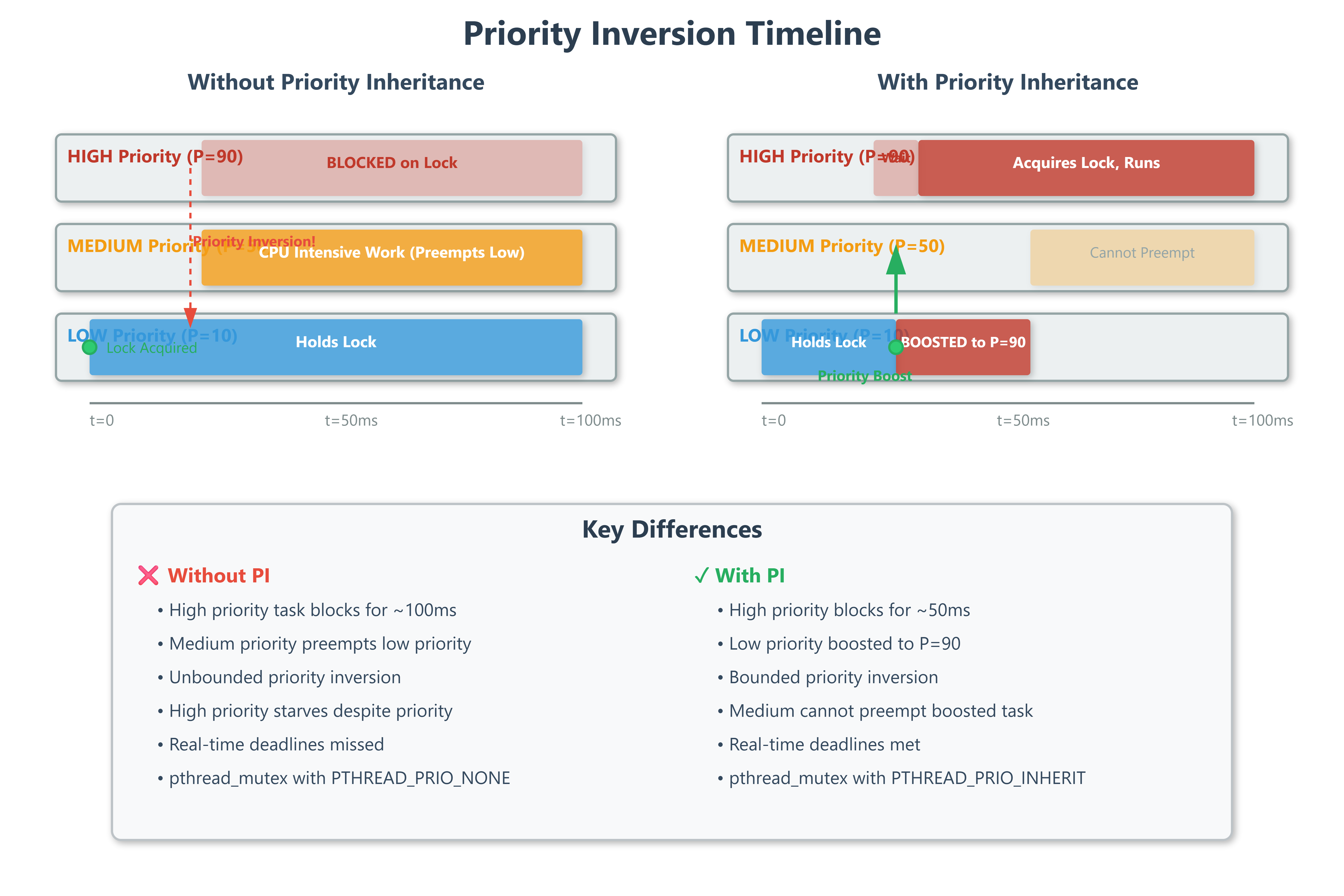 Three processes walk into your real-time system. High-priority audio processing needs a buffer lock. Low-priority data logging holds it. Medium-priority network I/O preempts the logger. Your audio thread starves, and you hear pops in the output every few seconds. Welcome to priority inversion—the scheduling anomaly that reset Mars Pathfinder in 1997 and still causes deadline misses in production systems today.